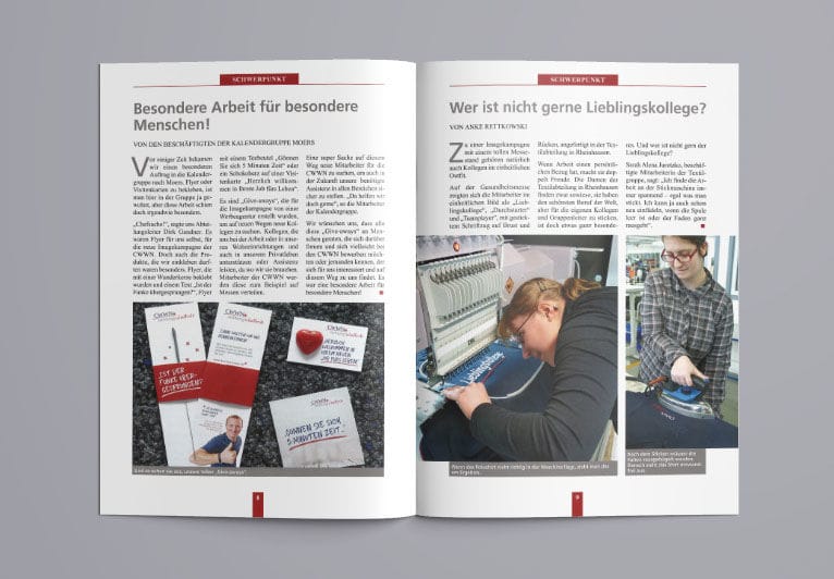 Auf elf Seiten stellt die CWWN in ihrer Zeitschrift „durchblick“ die Entwicklung und Umsetzung der Kampagne sowie der Mittel und Maßnahmen vor. Mitarbeiter, die beim Fotoshooting mitgewirkt haben, erzählen ganz persönlich über ihre Erlebnisse als Models, Mitarbeiter in den Werkstätten schildern die Realisierung der Messekleidung und Give-aways, die bei den CWWN gefertigt wurden. Die Begeisterung und auch Stolz der Mitarbeiter dabei zu sein wird deutlich spürbar.