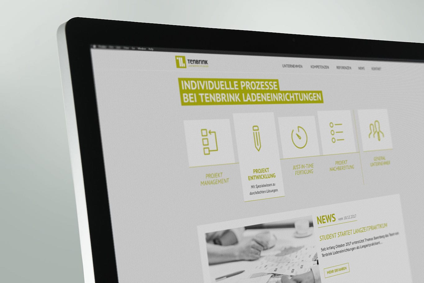 Mit der kreativen Leitidee „Der Weg ist das Ziel“ übersetzte Team Meuter die Positionierung in einen visuellen Gestaltungsrahmen, der die strukturierte Arbeitsweise von Tenbrink Ladeneinrichtungen widerspiegelt. Hierbei setzten die kreativen Köpfe von Tenbrink und Team Meuter auf eine selbstbewusste Tonalität und eine fokussierte Bildwelt, die in einem Fotoshooting mit den Mitarbeitern umgesetzt wurde. Ein gradliniges Layout und passende Prozess-Animationen runden den Gesamteindruck ab.